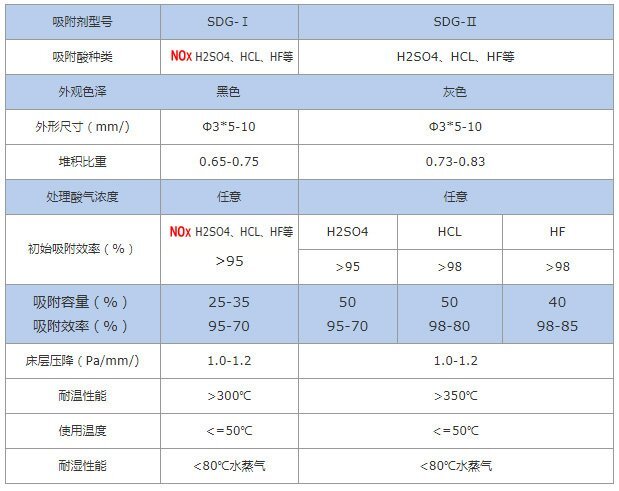SDG2型吸附劑,可以理解為普通型吸附劑,可以處理硫酸霧(H2SO4)、HCI、HF等,強酸氣體,都有不錯的效果!但是對氮氧化物(NOX)處理效果稍差。